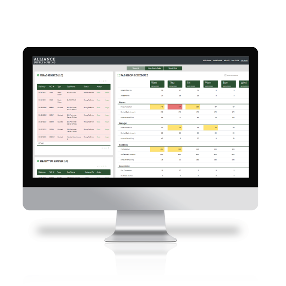cutting machines. The Shop Lead has access to a real-time queue of work orders waiting to be scheduled, as well as a color-coded summary view of the upcoming workload, letting them quickly identify and plan around their busiest days.